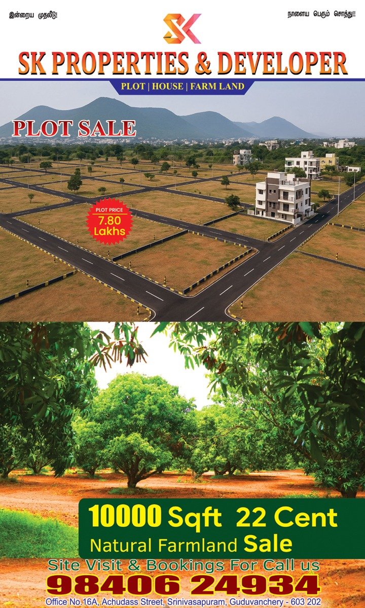 SK Properties and Developer offers fertile and well-located farmland ideal for agriculture, investment, and peaceful countryside living. Our farmlands are carefully selected with rich soil quality, reliable water sources, and excellent accessibility, ensuring long-term productivity and value appreciation. Whether you are planning organic farming, weekend farming, or a secure land investment, we provide legally clear, verified farmland options. From site selection to registration, our team guides you through every step, making farmland ownership simple, safe, and rewarding.